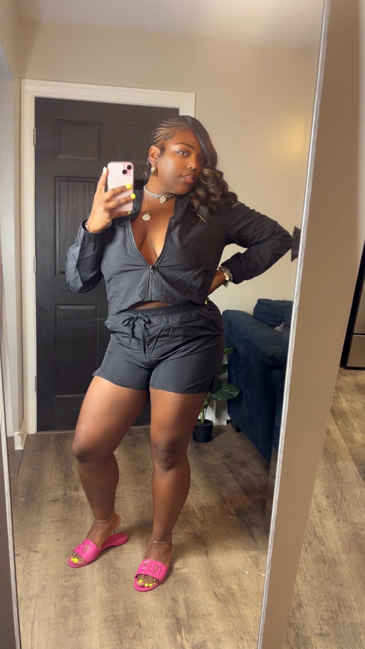 Your new go-to for effortless style and all-day comfort. This lightweight windbreaker set features a cropped zip-up jacket with a deep V design that lets you adjust your look from sporty to chic in seconds. The matching drawstring shorts are high-waisted with a relaxed fit, making them perfect for running errands, brunch dates, or lounging in style.