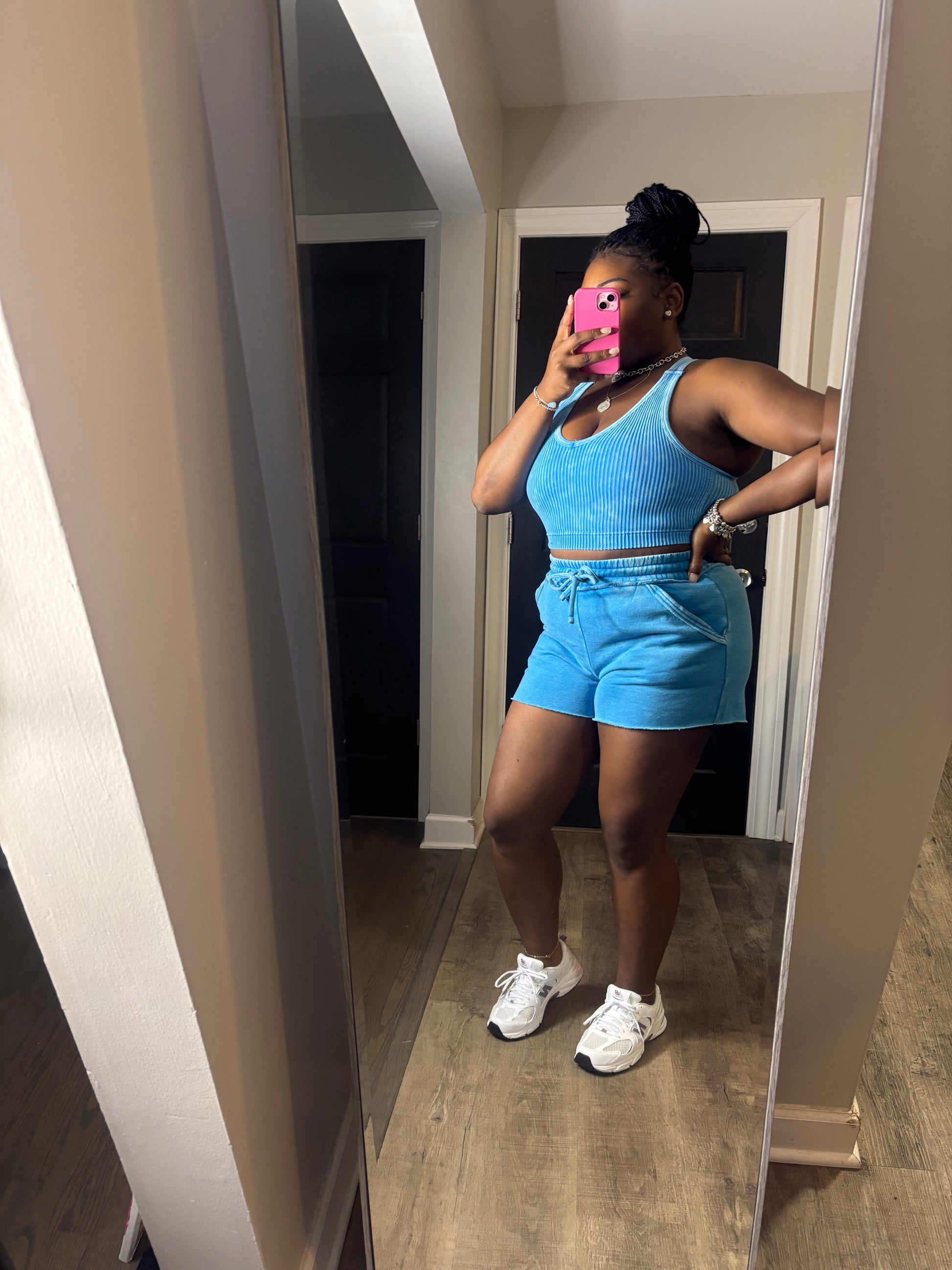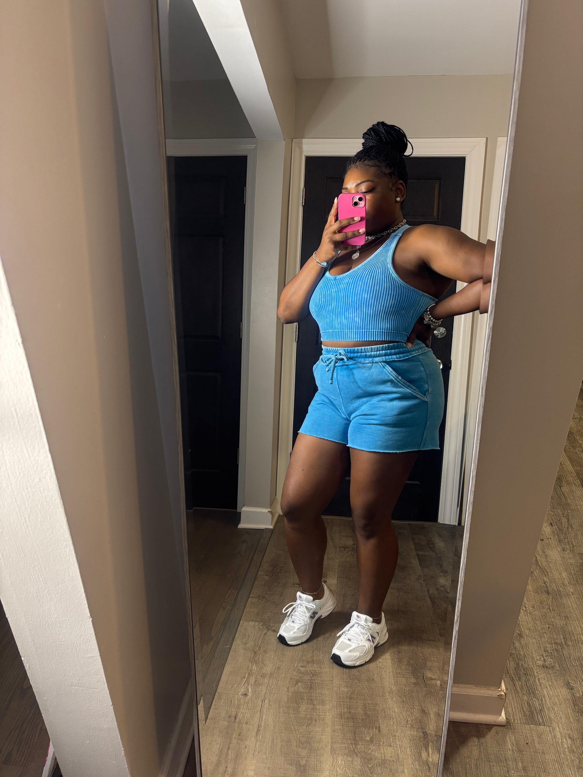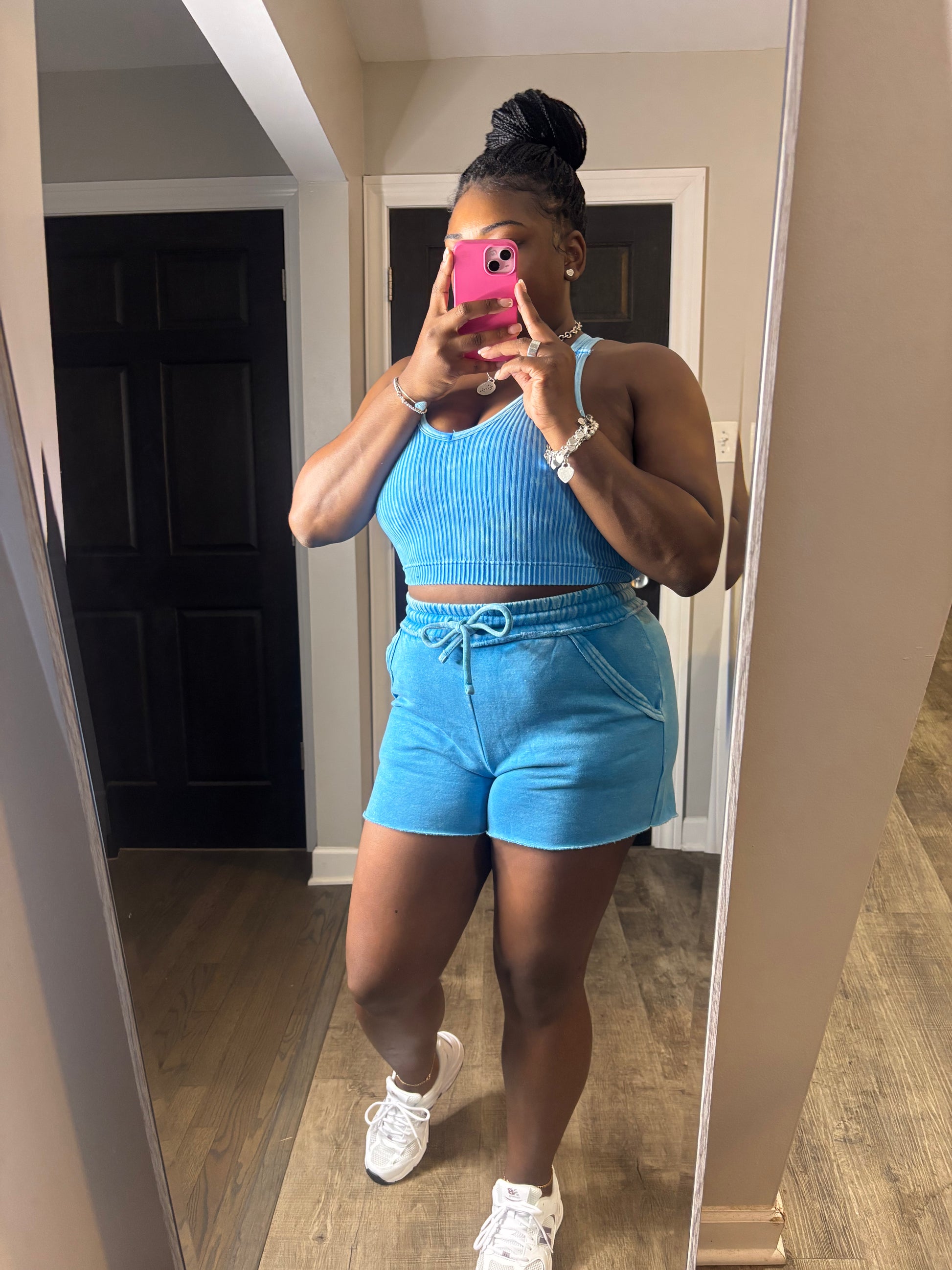 Get ready to lounge in style with this Blue Acid Wash Short Set! Featuring elastic wash shorts with handy pockets and a matching seamless racerback tank top, it’s the perfect combo for comfy, cozy, and chill vibes all day long. Whether you’re relaxing at home or stepping out, this playful set keeps you cool and carefree.