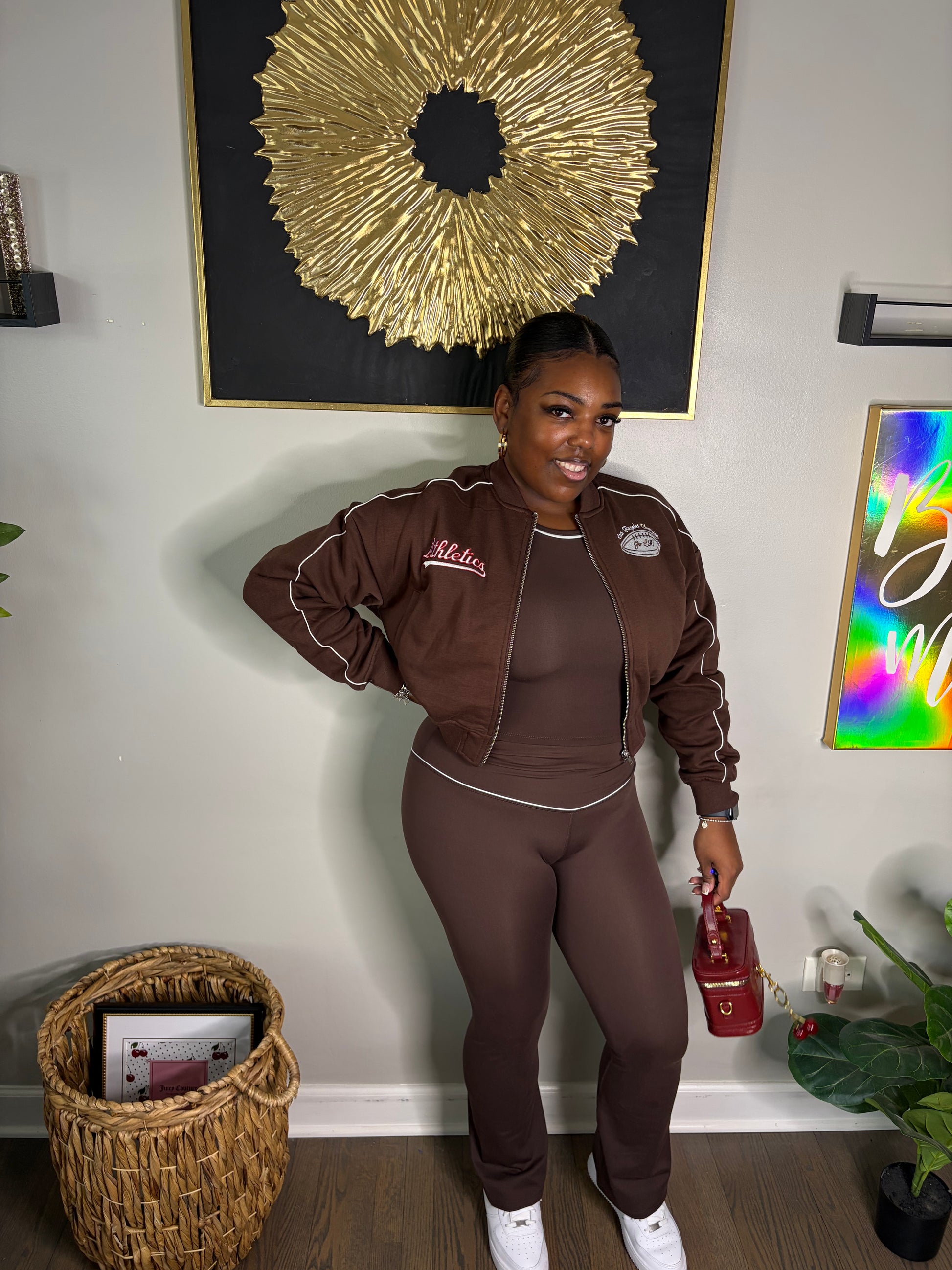 Your new go-to set for looking put-together while staying comfortable all day. This chocolate brown athletic set features a flattering stretch fit, soft feel, and sporty jacket detail — perfect for errands, travel days, casual hangs, or content days when you still want to look cute.