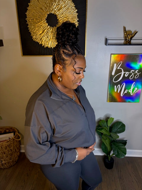Your “throw on and still look expensive” set. This charcoal two-piece includes a comfy zip-up hoodie with pockets and buttery-soft leggings that stretch like crazy while still hugging your curves—snatched, smooth, and ready for errands, travel, or chill days.