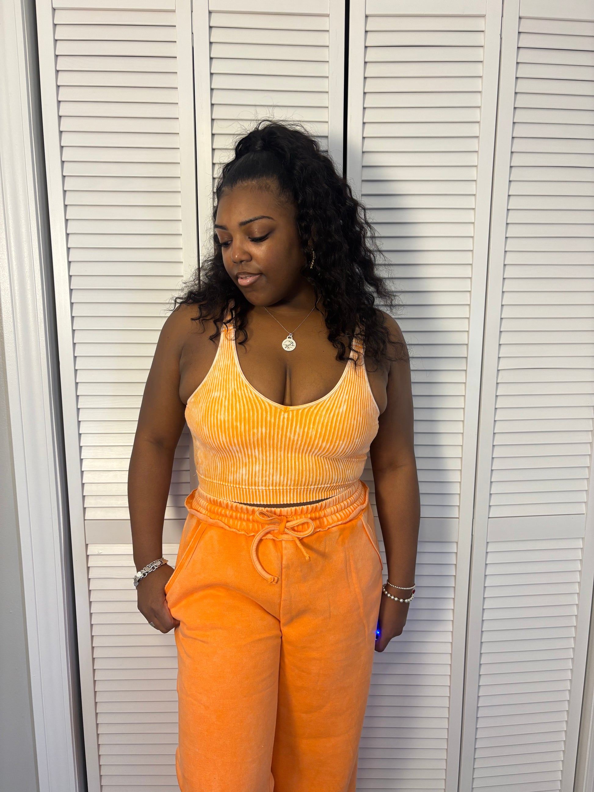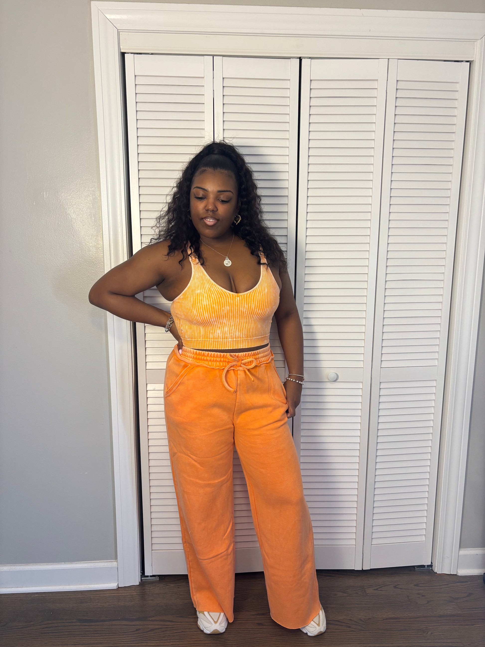 Unleash your inner fashionista with our Comfy Acid Wash Pants Set! These ultra-soft fleece palazzo sweatpants come with convenient pockets and a matching ribbed cropped bra padded tank top. Perfect for lounging or running errands in style. Get your cozy on!