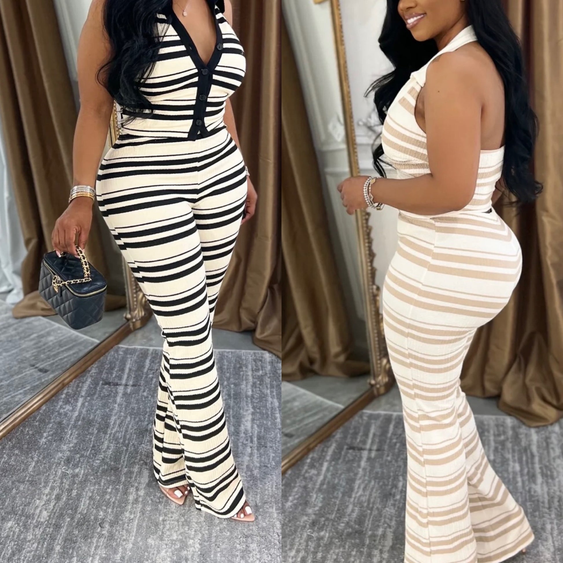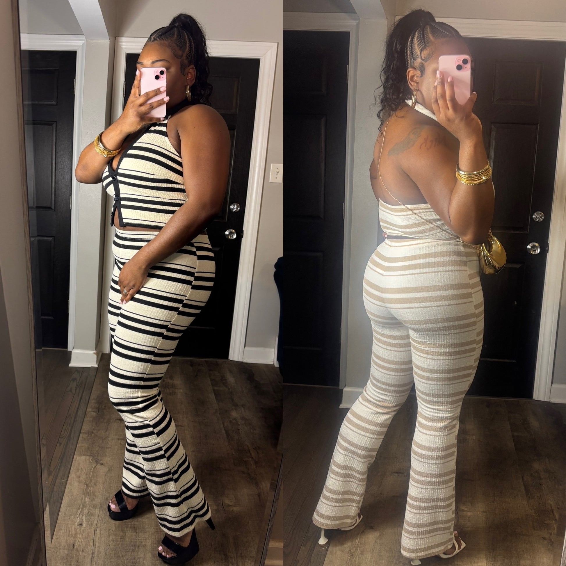 Turn heads and make bold moves in our Stacked & Snatched Set. This two-piece showstopper features a halter-style, open-back top that gives sexy without trying, and matching high-waisted flare pants that hug all the right curves. Designed with tall girls in mind, this set brings length and stretch — thanks to its soft, ribbed fabric and elastic waistband for a comfortable, body-contouring fit. Whether you’re stepping out or staying chill, this look does it all.
